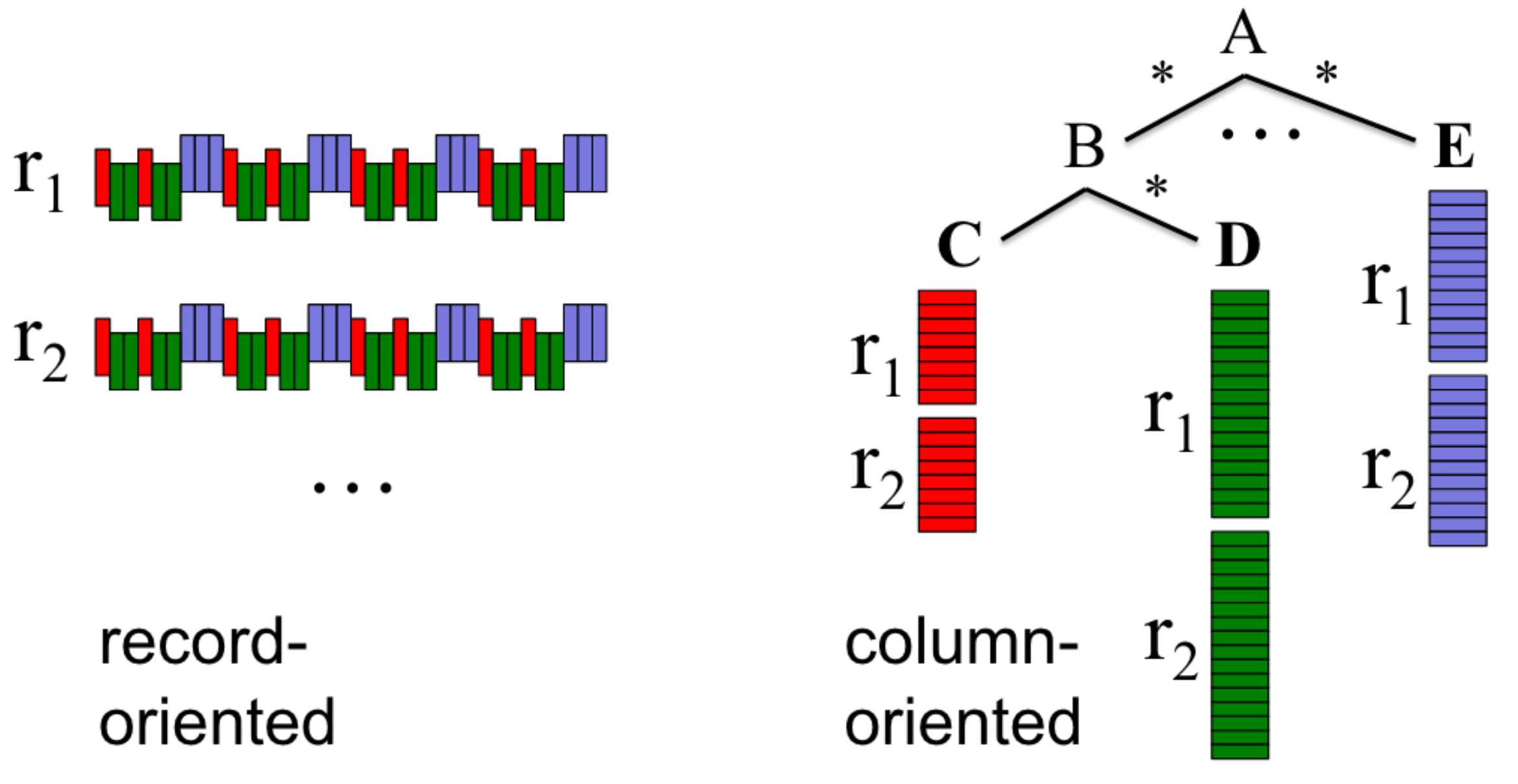 A graph from dremel paper explaining the difference between record-oriented storage and column-oriented storage.