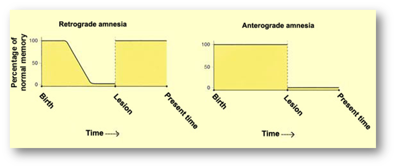 - Anterograde: Can’t form new memory. Caused by hippocampus damage. Things can’t be remembered after the damage of hippocampi. Can only remember things when kept in working memory.
